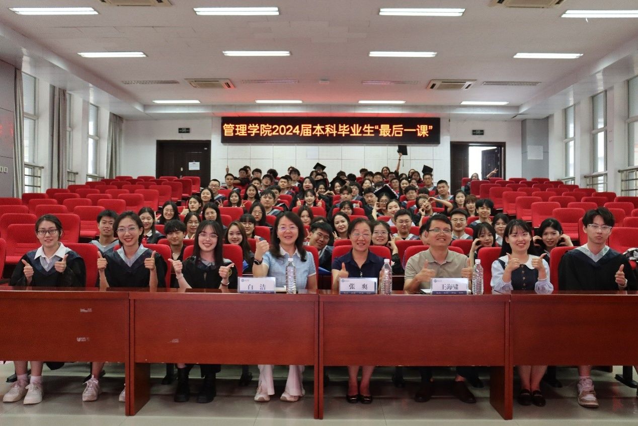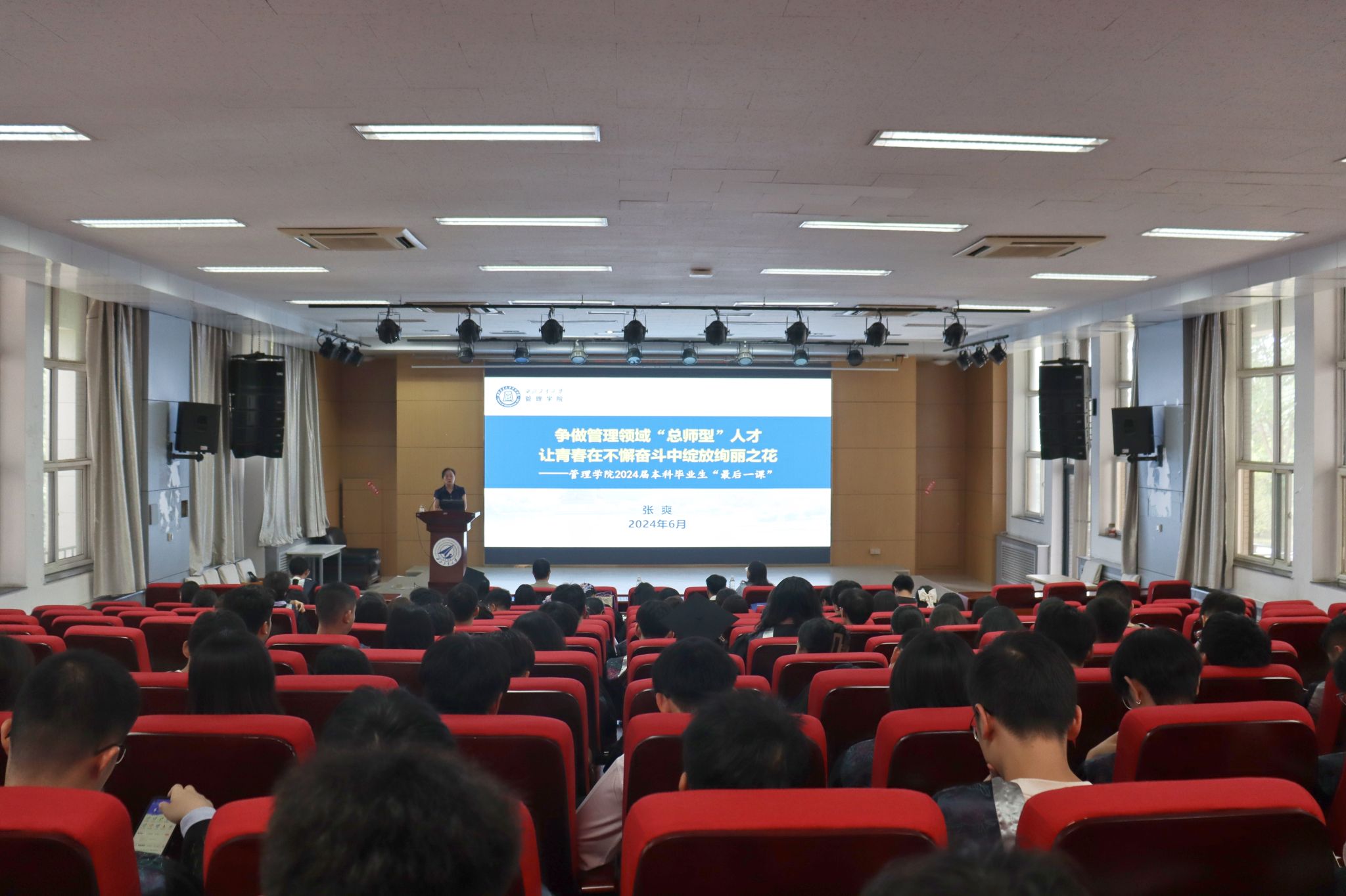 党委书记张爽为2024届本科生讲授以《争做管理领域“总师型”人才,让青春在不懈奋斗中绽放绚丽之花》为题的“最后一课”。本次活动由学院党委副书记王海啸主持,院长助理白洁、毕业年级辅导员和全体本科毕业生参加。