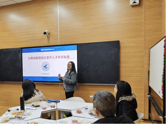 海外讲席教授实施办法》等文件的核心要点,鼓励大家充分利用学院对青年教师的政策支持,加快个人的成长发展。学院人事秘书王霄围绕学院制定的准长聘岗位各类标准,梳理了准聘期内的注意事项,强调青年教师要提前做好规划。最后,学院教师发展分中心副主任杨倩针对准聘教师岗位晋升中人才培养的要求,从承担课程教学、指导学生和标志性成果三个方面为与会教师进行了系统解读,并对2023年校级教学竞赛进行了动员。与会老师们积极参与到各个话题的交流讨论中,整场研讨会在热烈的讨论氛围中落下帷幕。
