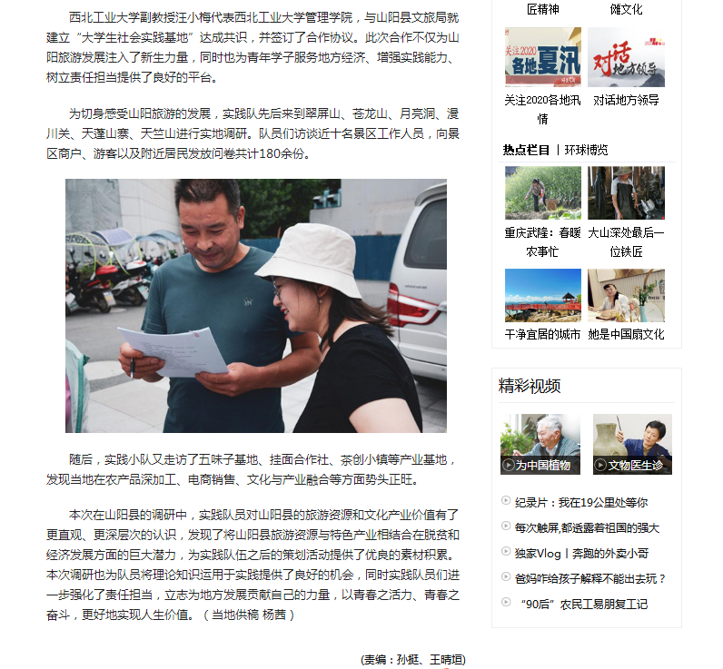 9月7日,人民网陕西频道,以《三下乡|厕拍 暑期实践队开展旅游资源实地调研》为题,报道了厕拍 “助力山阳”实践队,暑期赴商洛市山阳县进行山阳全域旅游资源实地调研活动。