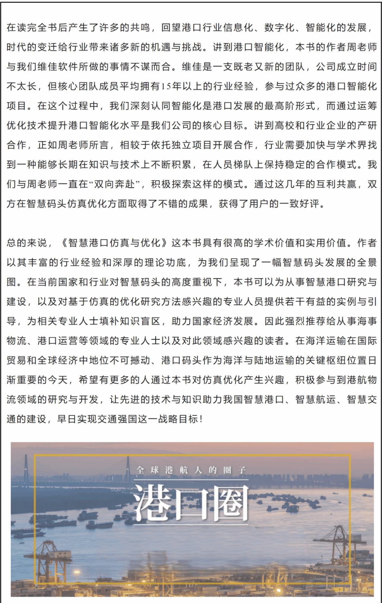 近日,“港口圈”公众号,行业内的权威媒体,推出了一篇深度书评,对《智慧港口仿真与优化》一书进行了全面解读。这本由周琛淏教授撰写的专著,集中展现了产学研协同创新在推动港口智慧化发展、行业技术进步等方面的重要作用。