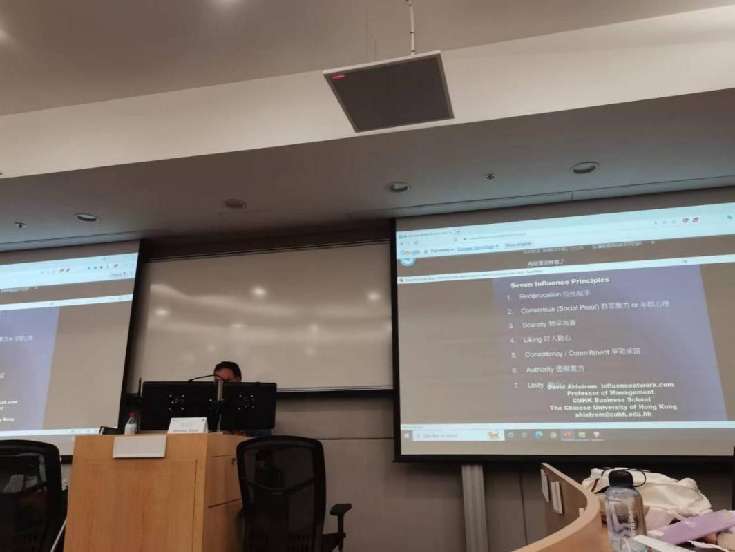 香港中文大学管理学系教授David Ahlstrom主要围绕“Six Influence Principles”展开课堂,他为同学们介绍了许多社会实验,让大家通过实验结果寻找规律,启发了学生对于如何合理有效进行营销的思考。