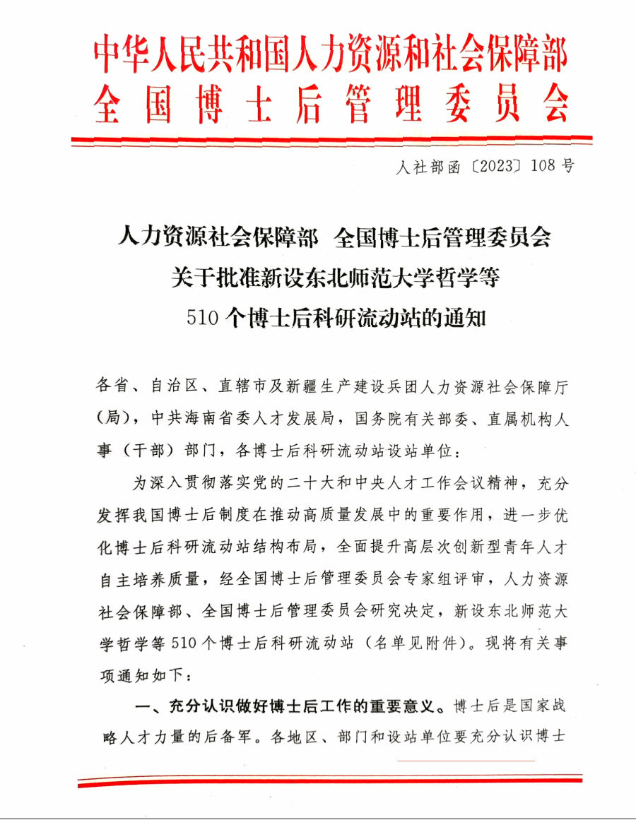 近日,人力资源和社会保障部、全国博士后管理委员会联合下发《关于批准设立东北师范大学哲学等510个博士后科研流动站的通知》(人社部函〔2023〕108号),厕拍