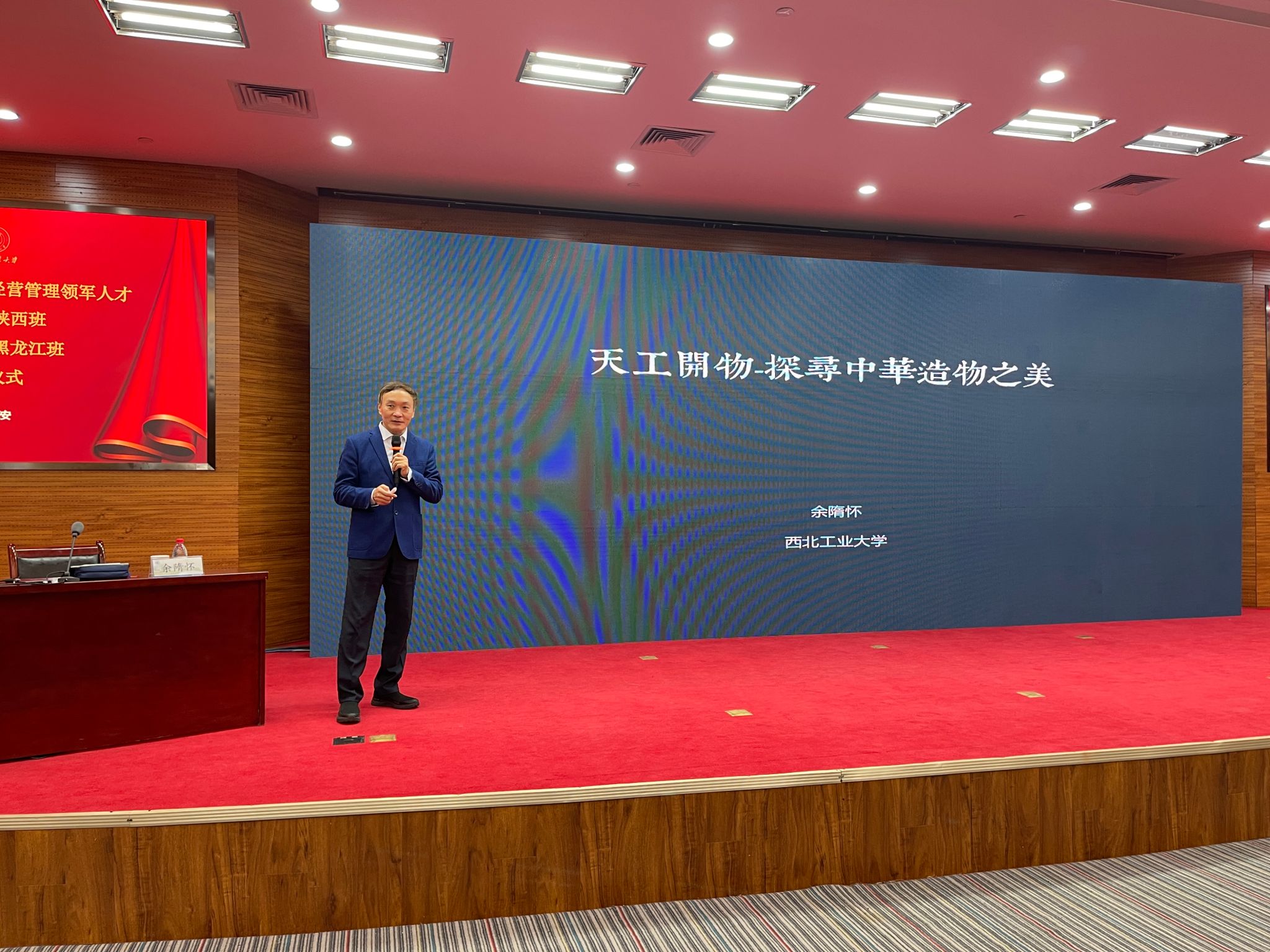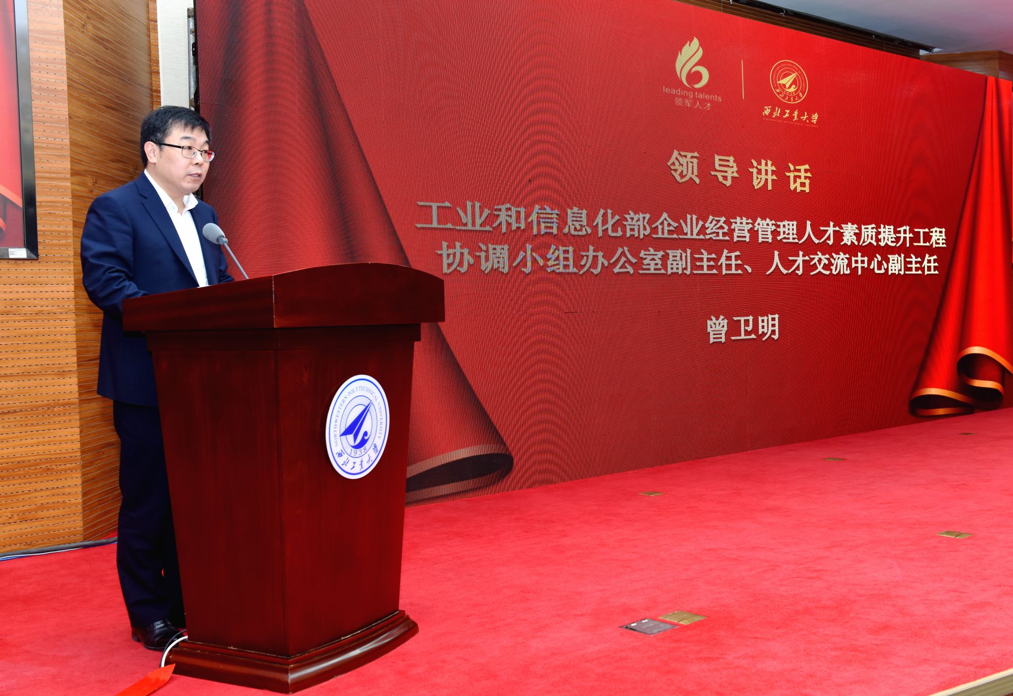 曾卫明副主任讲话,向新加入领军大家庭的企业家朋友们表示欢迎,向即将结业的领军学员们表示祝贺。工信部历来高度重视中小企业发展,详细介绍了中小企业经营管理领军人才培训项目的培训体系、丰硕成果和重要意义。希望同学们学习弘扬“秦人精神”,即厚重质直、忠义仁勇、信守承诺、热爱桑梓;学习弘扬优秀企业家精神;学习弘扬西工大“公诚勇毅”校训和“三实一新”校风。静下心来学习,致力学有所思、思有所得、得有所用、用有所成,不断提升自己,为推进新型工业化、建设制造强国和网络强国贡献智慧和力量。