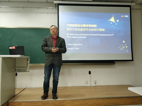 Haibo Wang教授作了“大数据驱动与需求导向的第四方物流服务平台的设计框架”的报告。他首先从第四方物流的架构谈起,详细介绍了第四方物流的发展历程和其主要组成部分,阐述了第三方物流和第四方物流的区别。然后,Haibo Wang教授通过列举大量的数据和研究成果,解释了为什么需要第四方物流。