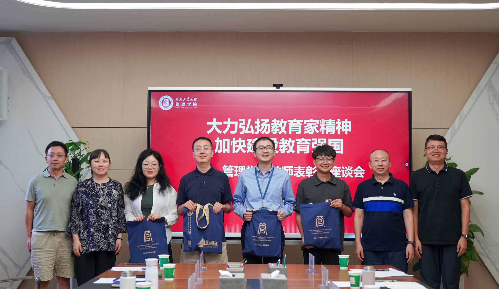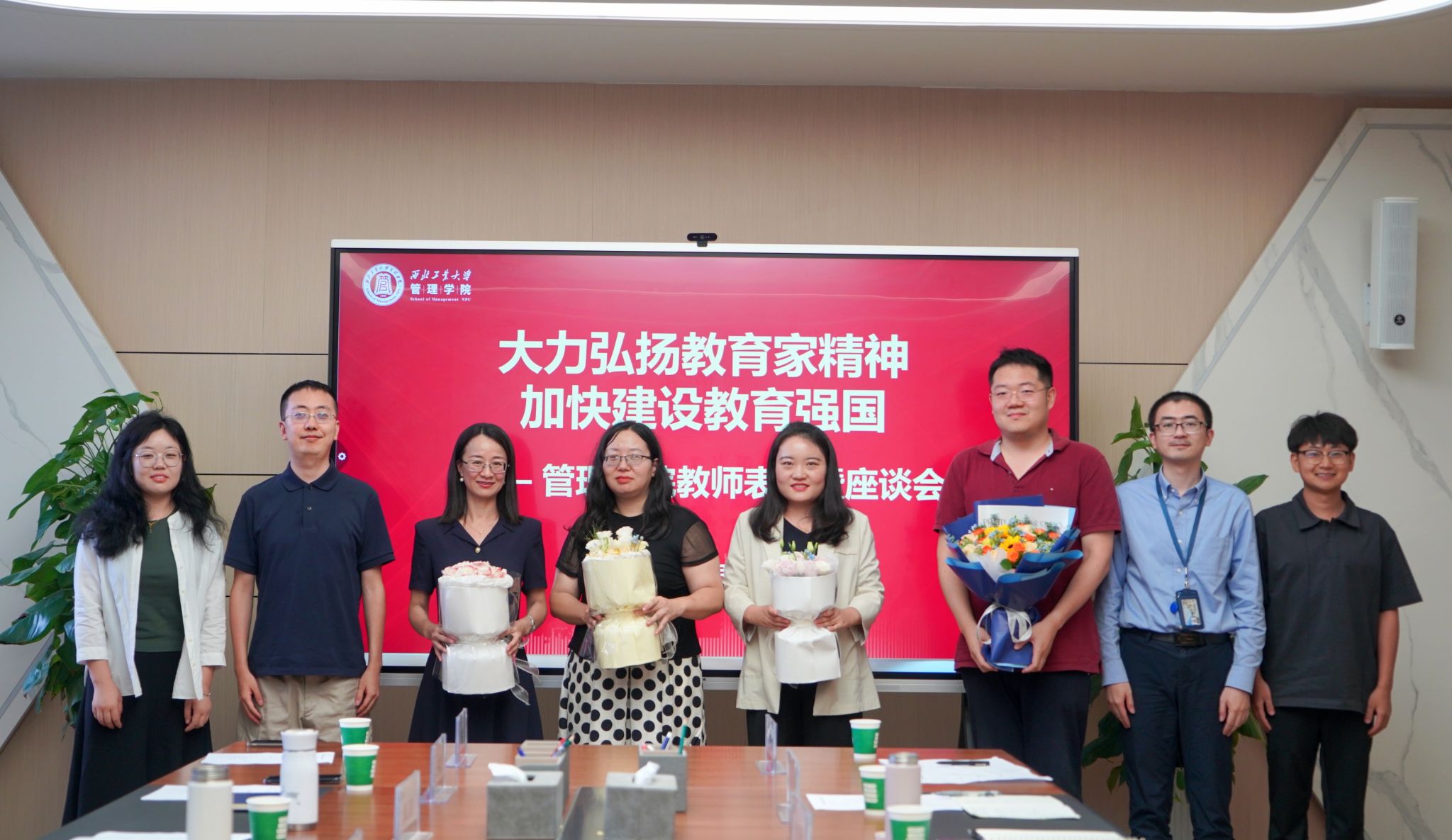 青年教师为受表彰教师献花,院领导为几位新入职的青年教师颁赠激光笔等入职纪念品,以激光笔喻戒尺、教鞭,既是传承教育之鞭也是鞭策上进之意。意在希望各位青年教师接过育人之鞭,以优秀前辈为榜样,真正把为人、为事、为学统一起来,努力成为“经师”与“人师”的统一者。