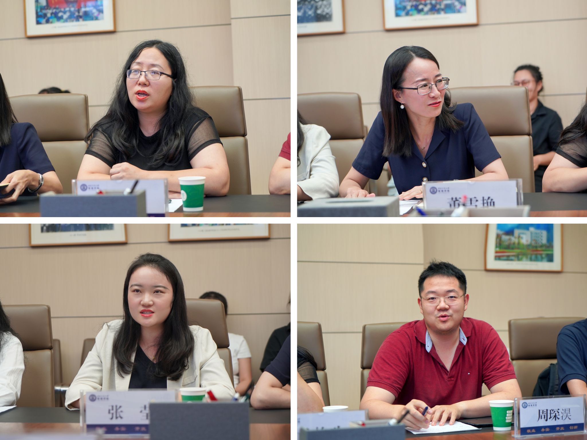 本科生最满意教师孟艳玲老师、本科教学卓越新秀董雪艳老师、优秀青年教师(吴亚军奖)特等奖张莹老师、优秀班主任周琛淏老师依次发言,几位近期受学校表彰的教师代表围绕会议主题,结合自己的教学、科研和学习经历,讲述了对教育事业的热爱与追求,并就从教经历和心得收获等方面分享体会,为校、院事业发展和新时代教师队伍建设建言献策。