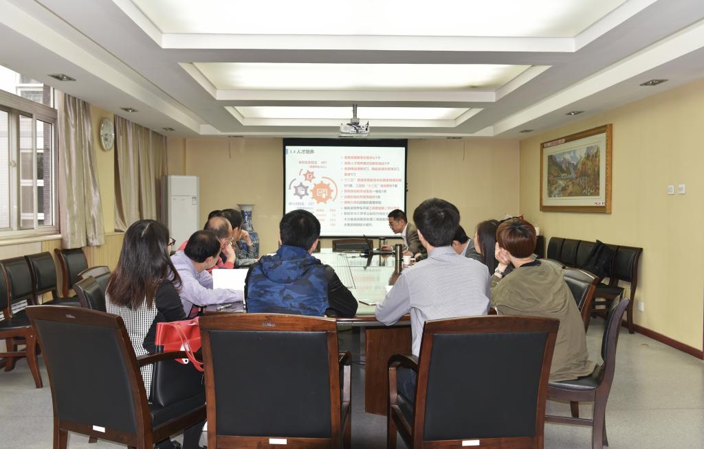、学院当前存在的问题、建设思路与目标、建设举措等四个方面将学院的情况进行了汇报。他指出当前学院工作存在学科发展水平不均匀、人才培养质量不够高、师资队伍建设有待加强等问题,针对这些现存问题明确了发展的短期目标和长期目标,从学科发展方向、师资队伍建设、人才培养、科学研究、社会服务等方面提出详细的建设举措。