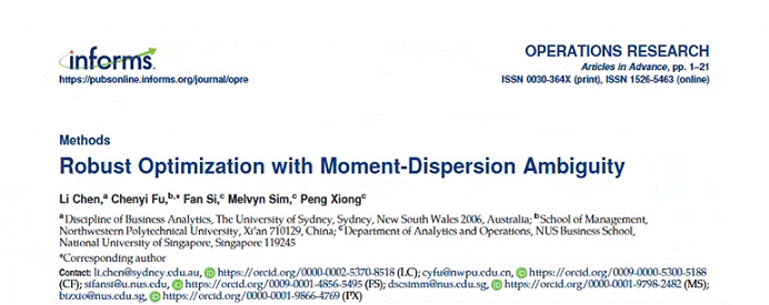 教授傅陈翼与合作者的研究成果“Robust Optimization with Moment-Dispersion Ambiguity”在《Operations Research》期刊上在线刊登,傅陈翼为论文通讯作者(排序第二)。《Operations Research》是运筹学和管理学研究协会(Informs)期刊,为运筹学领域顶级期刊,是美国University of Texas at Dallas所选出的商学院最顶尖24种学术期刊(简称UTD24)之一。