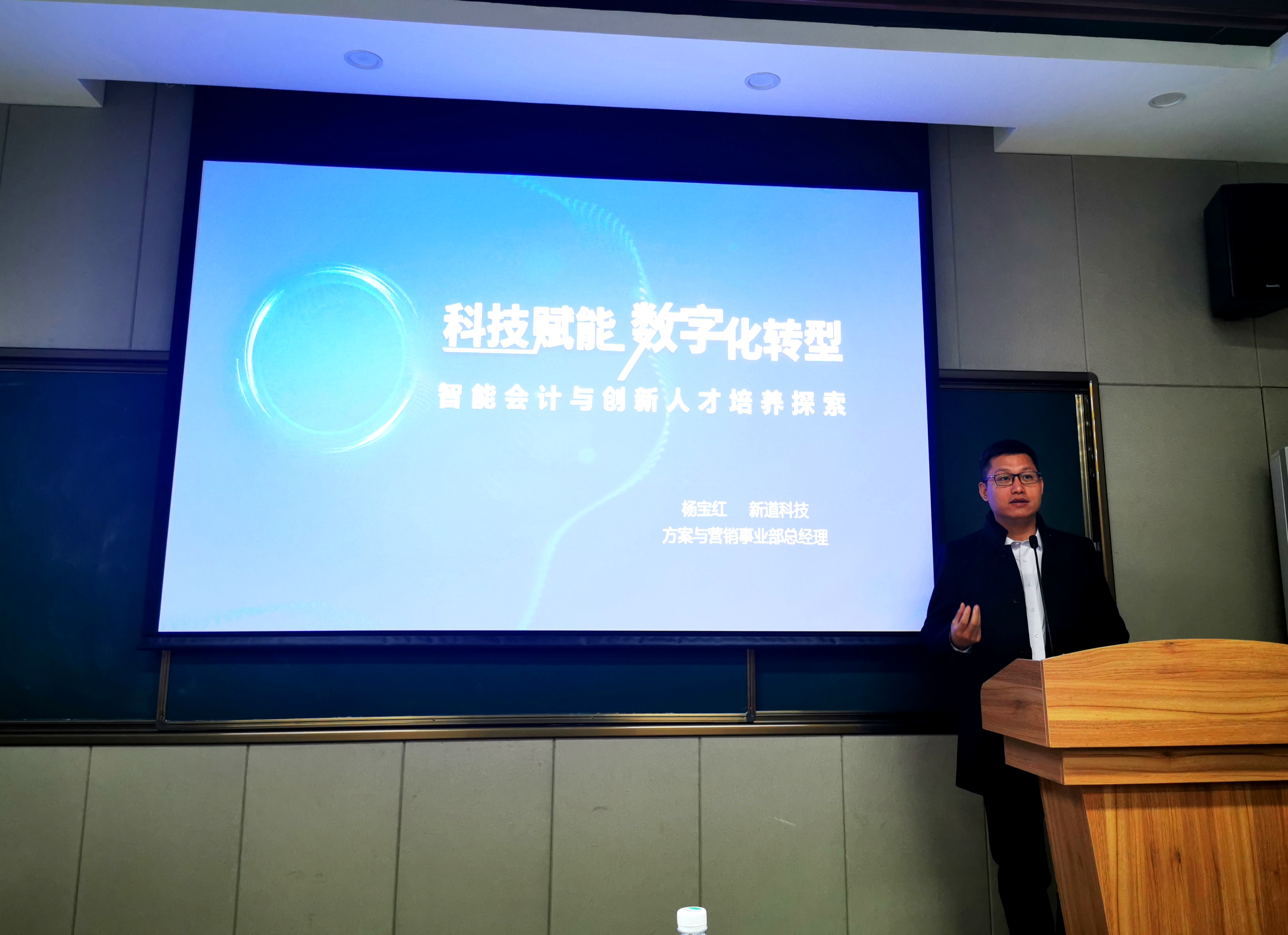 副院长田高良教授、中兴新云服务有限公司总裁陈虎和新道科技公司方案研究与营销事业部总经理杨宝红分别作了主题报告。