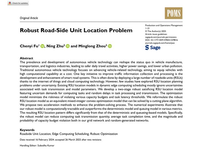 教授傅陈翼以第一作者在《Production and Operations Management》期刊上在线刊登题为“Robust Road-Side Unit Location Problem”的研究成果。合作者包括中国科学技术大学朱宁教授和复旦大学周明龙副教授。《Production and Operations Management》是运营管理领域顶级期刊,是美国University of Texas at Dallas所选出的商学院最顶尖24种学术期刊(简称UTD24)之一。