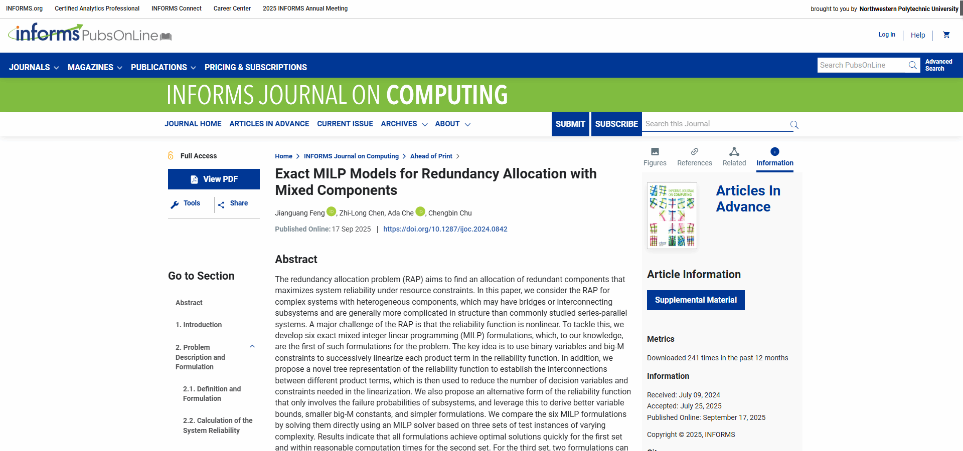 冯建广副教授的研究成果“Exact MILP Models for Redundancy Allocation with Mixed Components”,厕拍