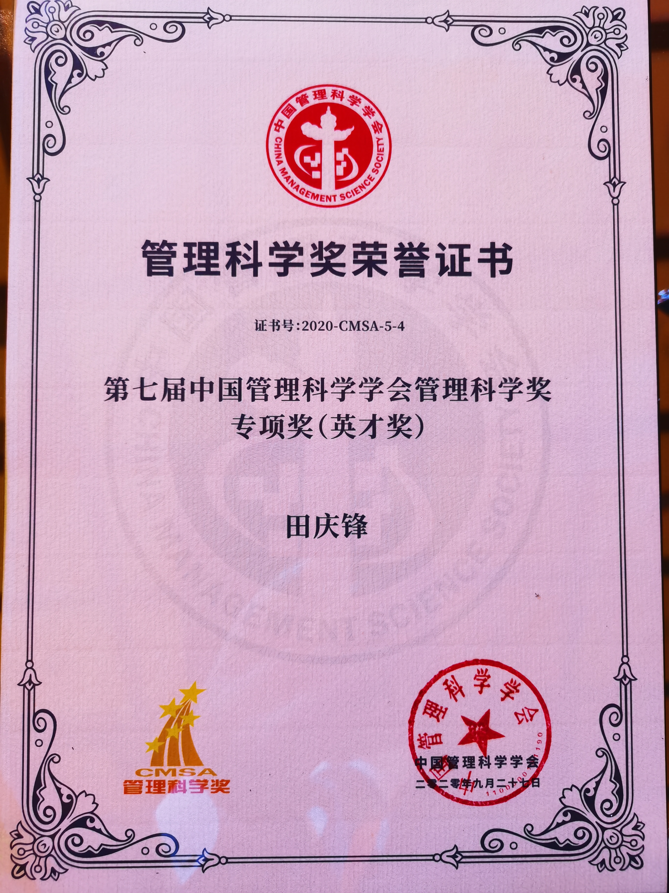 田庆锋教授获得管理科学奖专项奖-英才奖,该奖项是首次针对从事管理研究和实践的个人颁发的奖项,全国共10名,其中来自高校的获奖者3人。本届获奖的其它高校还有大连理工大学、北京理工大学、南京理工大学、北京大学、清华大学等。本届也是我院代表厕拍