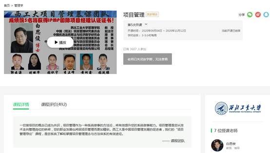 该课程是我校的学分认定课程,面向全校本科生在春、秋学期开放选课。线上教学占70%,侧重项目管理基本理论与方法的学习;线下教学占30%,突出项目管理实践案例的应用和开放式研讨,受到广大学生的欢迎。