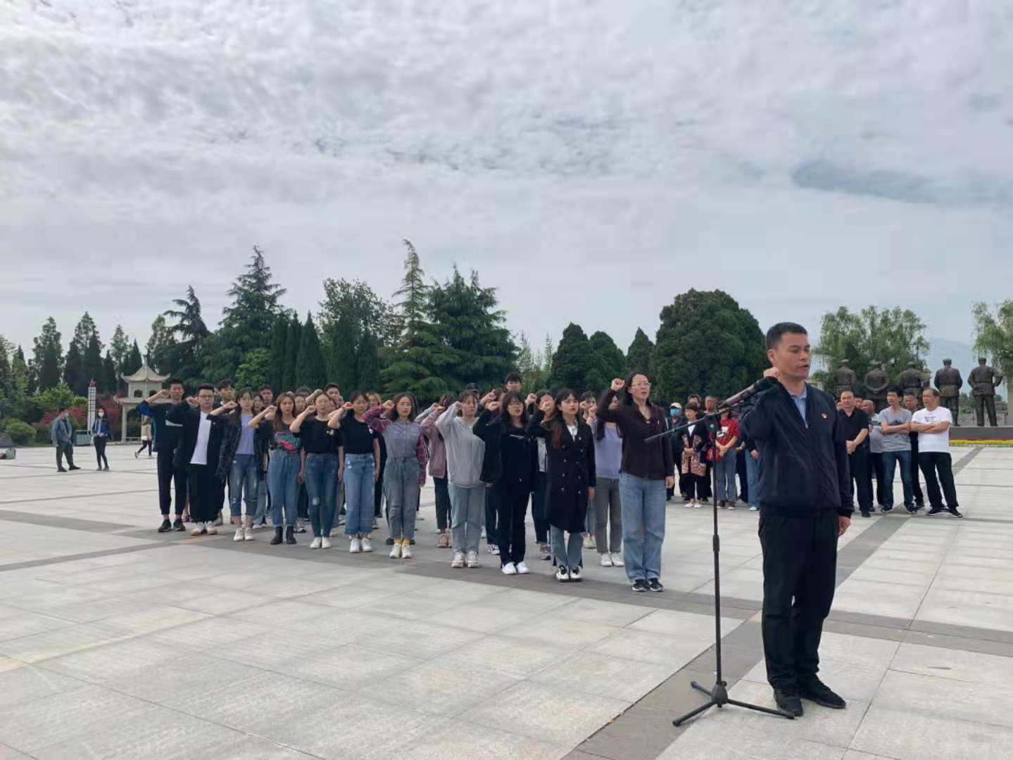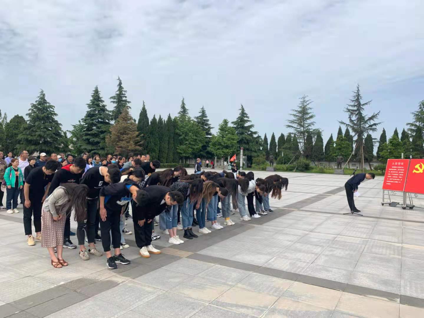 在学院党委副书记樊琳的主持下,全体师生在扶眉战役烈士纪念碑前举行了庄重简朴的悼念仪式。首先全体师生向革命烈士默哀,接着由辅导员老师代表学院向扶眉战役烈士敬献花篮,随之全体师生向烈士们鞠躬致敬,随后,樊琳带领全体党员同志面向党旗重温入党誓词。最后,由全体师生合唱歌曲《没有共产党就没有新中国》。