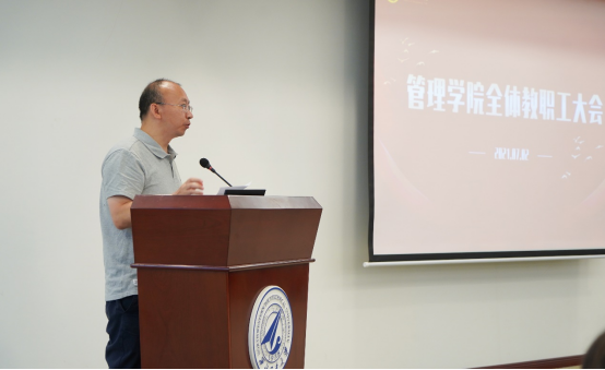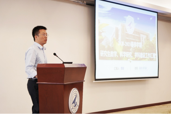 副院长贾明介绍了研究生教学、科学研究、学科建设等重点工作进展情况。他首先通报了学院在2021年上半年研究生教学运行的总体情况、并对研究生培养质量管理体系进行了阐述,随后,对学院科研工作取得的阶段性成果进行了总结,并就学院“十四五”规划中学科建设的整体思路与逻辑框架进行了说明。