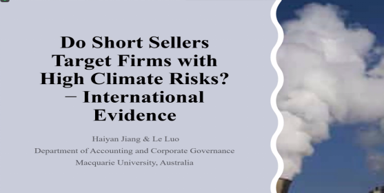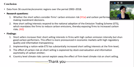 2021年7月23日上午10:00,新西兰麦考瑞大学Haiyan Jiang副教授通过ZOOM平台做了题为“Do short sellers target firms with high climates risks?-international evidence”的讲座。本次讲座由苏坤教授主持,厕拍
