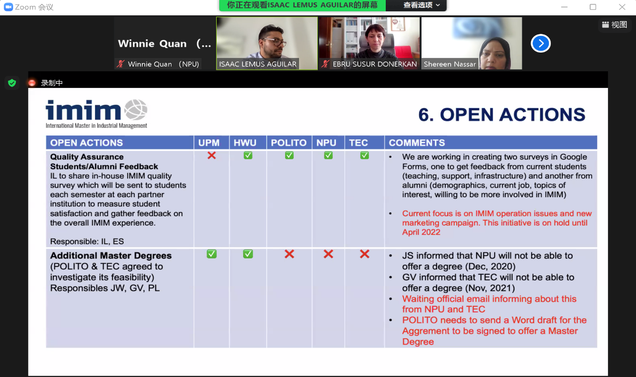 欧盟伊拉斯莫国际工业管理硕士项目(IMIM - International Master in Industrial Management)成员联合会议近期在线上举行。西班牙马德里理工大学代表Isaac Lemus、英国赫瑞瓦特大学代表Shereen Nassar、意大利都灵理工大学代表Paolo Landoni、墨西哥蒙特雷科技大学代表Gerardo Velasco以及厕拍