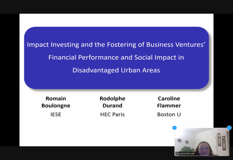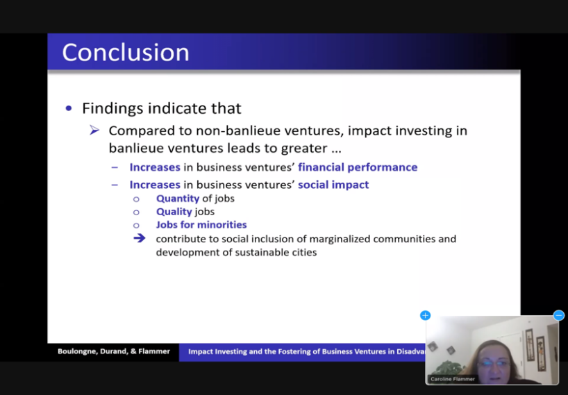 Caroline Flammer教授探讨了当投资给到弱势城市地区(即失业率高和贫困的地区)的企业时,影响力投资在促进商业企业成功和社会影响力方面是否更有效的问题。基于法国“郊区”和“非郊区”的商业企业贷款背景,她的研究发现表明郊区企业发放贷款有助于提高企业财务绩效,同时在创造当地就业机会、高质量就业和少数民族就业方面产生了较高的社会影响。这些结果显示,影响力投资者能够与郊区未实现更大潜力的企业签订合同,因为郊区企业往往被排除在传统贷款市场之外。这一点在一项受控实验室实验中得到了证实。在该实验中,被要求担任信贷员的商业专业人士被随机分配到只在地理位置上有所不同的商业企业。研究发现,与非郊区企业相比,参与者向郊区企业提供贷款的可能性较低。贾明教授向Caroline Flammer教授致欢迎辞,他表示,此次讲座为厕拍