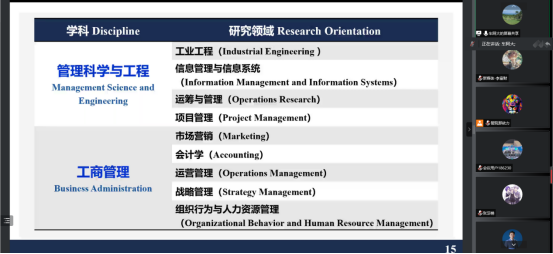 历史做以回顾,随后道出学院的育人愿景、育人使命与价值观,并介绍了学硕博阶段的学科与专业建设情况。在师资队伍角度,院长对学院现有师资情况做以描述,学院现有专任教师93人,其中博士化率高达93%,人才称号19人次……并对学院管理科学与工程、工商管理两大类的知名学者做以介绍。在科学研究角度,院长针对重大工程项目管理、国防科技企业创新管理等研究特色做以讲解,强调学院在此类重点研究方向的突出作用与卓越贡献。同时再次强调管理在推动智慧医疗、财务共享云、低碳科技等前沿领域发展中的重要作用。在人才培养角度,院长对“本科生导师制”、“攀登计划”等名词做以介绍,鼓励22级新生们挑选自己感兴趣的方向选择导师,积极主动参加学院学校创新创业活动,精进学业、增长才干。