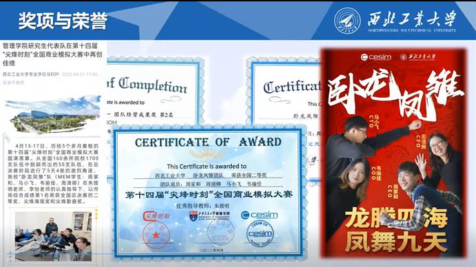 朱煜明教授宣读了二等奖获奖名单,并对所有获奖团队表示祝贺。Cesim中国西北服务中心负责人付玲老师表示,西工大的“尖烽时刻”校园赛通过赛教结合模式,促教利企,真正意义上实现“教学研用”相结合。商业模拟是经典的商科管理教育模式之一,本次“尖烽时刻”商业模拟校园赛,“以赛促教,以赛促学,以赛促创”,为学生搭建了学术交流与商业实践的平台,激发了学生的商业潜能,学以致用,锻炼了学生团队协作和积极应变能力,为培养复合应用型管理人才奠定了良好的基础。