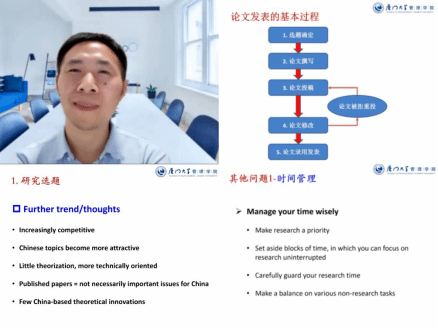 随后,罗进辉教授从论文发表的五个基本过程出发,介绍了选题确定、论文撰写、论文投稿、论文修改和论文录用发表过程中的注意事项,强调在论文写作和投稿的整个过程中,要保持良好的心态。在论文选题上,罗进辉教授介绍了中英文论文选题的差异性,即英文论文选题强调文献导向,而中文论文选题更加强调问题导向;在论文撰写上,罗进辉教授认为研究方法没有优劣之分,强调“边用边学“;在论文投稿上,罗进辉教授强调了论文主题与目标期刊的匹配性、论文格式和行文规范符合目标期刊要求的重要性;在论文修改上,罗进辉教授提出应该珍惜修稿机会,尽最大努力回复审稿人的意见和建议,合理把握修稿时间;在论文录用发表上,罗进辉教授介绍了中英文论文发表的区别。