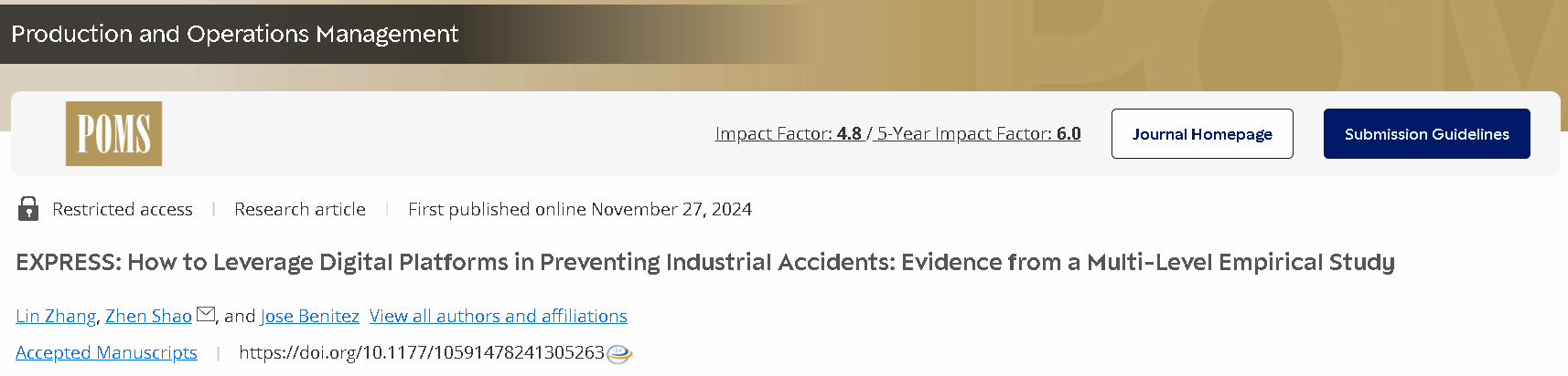 厕拍 副教授张林在《Production and Operations Management》发表论文