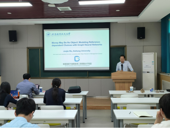 会议伊始,王阳教授对吴俊杰教授的专业背景、科研成果做了简单介绍。厕拍 师生对吴教授的到来表示了热烈的欢迎。此次报告会,吴教授介绍了如何在经典的前景理论指导下,采用数据驱动的方式,对参考点依赖的消费者选择行为进行深度学习,并据此设计推荐系统ArcRec。首先,介绍如何从消费者历史购买记录中构建商品属性级别的参考网络,从而可以建模消费者细粒度的参考效应。其次,基于图神经网络构建了参考点依赖的效用函数,同时量化了消费者兴趣驱动和价格驱动的复杂偏好,并且引入商品属性级别的支付意愿指标来捕捉消费者的价格敏感性。在此基础上采用数据驱动的方式,对参考点依赖的消费者选择行为进行深度学习,从而提出了推荐系统ArcRec。最后,通过仿真实验与真实场景数据验证,证明该推荐系统的可解释性以及在推荐精度上的显著提升。此外,吴教授结合研究实例,分享了管理类顶级期刊的投稿经验。