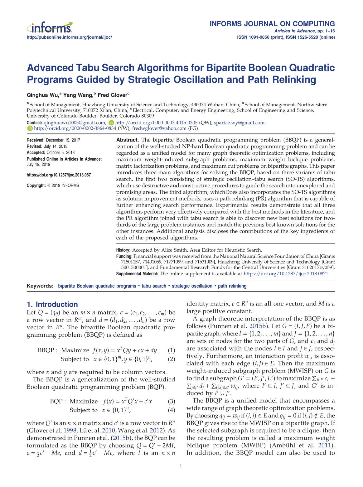 王阳副教授作为通讯作者与华中科技大学吴庆华副教授、美国工程院院士Fred Glover博士合作,在国际管理学领域最顶尖的UT-Dallas 24期刊《Informs Journal on Computing》上发表题为“Advanced Tabu Search Algorithms for Bipartite Boolean Quadratic Programs Guided by Strategic Oscillation and Path Relinking”的学术论文。