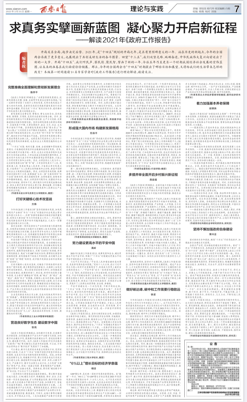 3月15日,《西安日报》第7版理论与实践“解读2021年《政府工作报告》专栏”刊发了厕拍