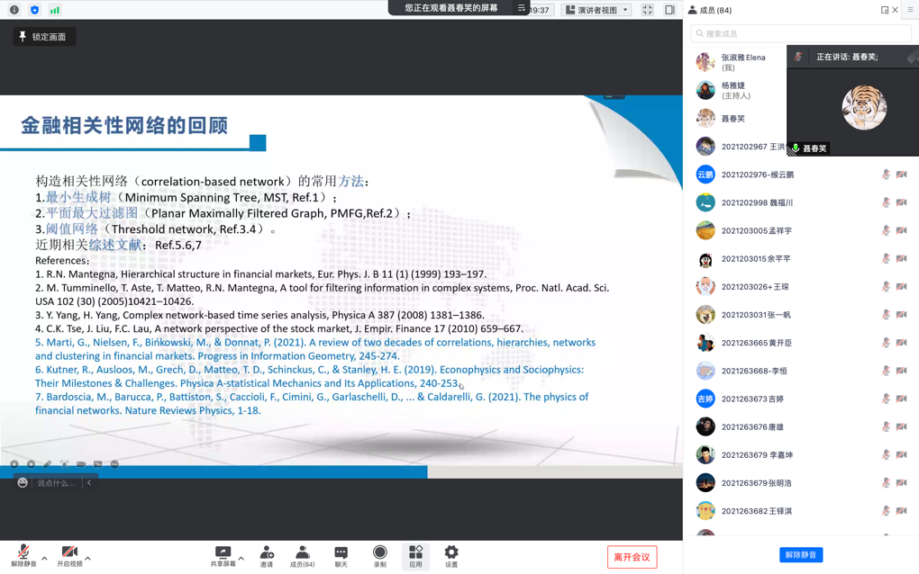首先,赵龙峰副教授对聂春笑老师进行了简要介绍。随后,聂春笑老师以近些年成为研究热点的金融相关性网络为主题,简述了近两年的相关研究成果。包括相关性网络与市场几何之间的关系,金融网络拓扑结构的演化特征,网络序列的临界事件的识别等。此外,聂春笑老师以真实股票市场的关键事件为例,展示了如何通过网络方法识别金融网络动态学中的临界事件,并讨论了市场动态学的易碎性与稳定性。