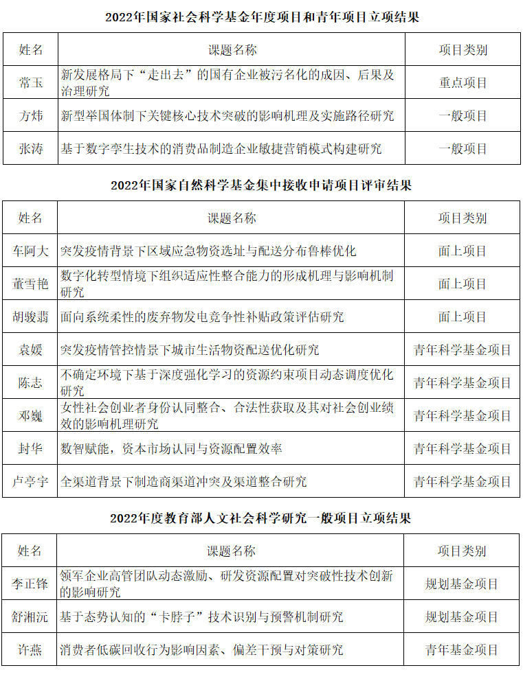 近期全国哲学社会科学工作办公室、国家自然科学基金委员会和教育部社科司相继公布了2022年度国家社科基金年度项目和青年项目立项结果、国家自然科学基金项目评审结果、教育部人文社会科学研究一般项目立项结果。我院共获批各类项目14项,其中国家社科基金重点项目1项、一般项目2项;国家自然科学基金面上项目3项、青年科学基金项目5项;教育部人文社会科学研究一般项目规划基金2项、青年基金1项。