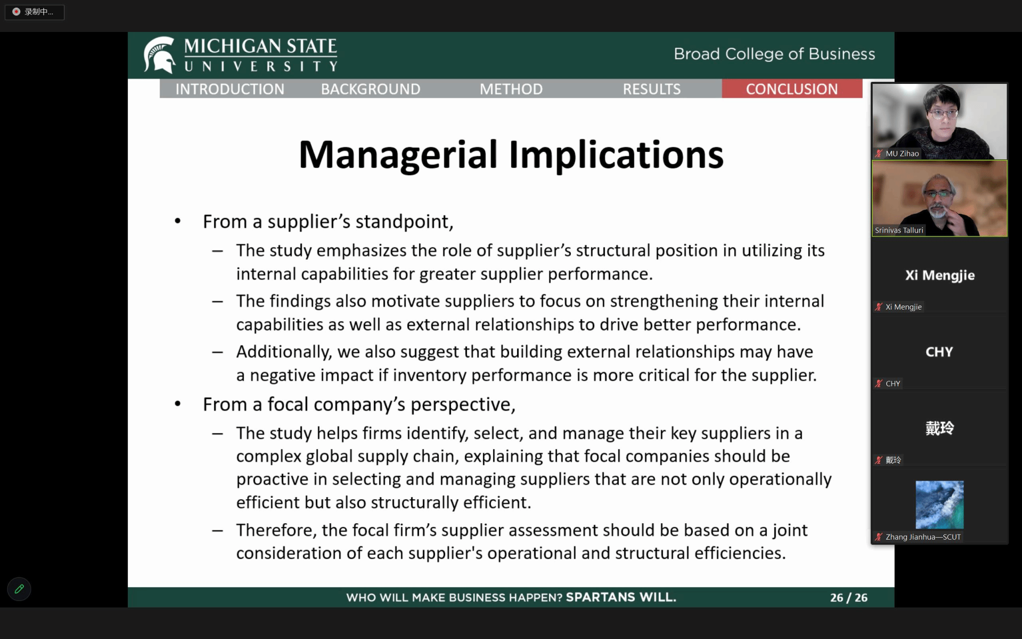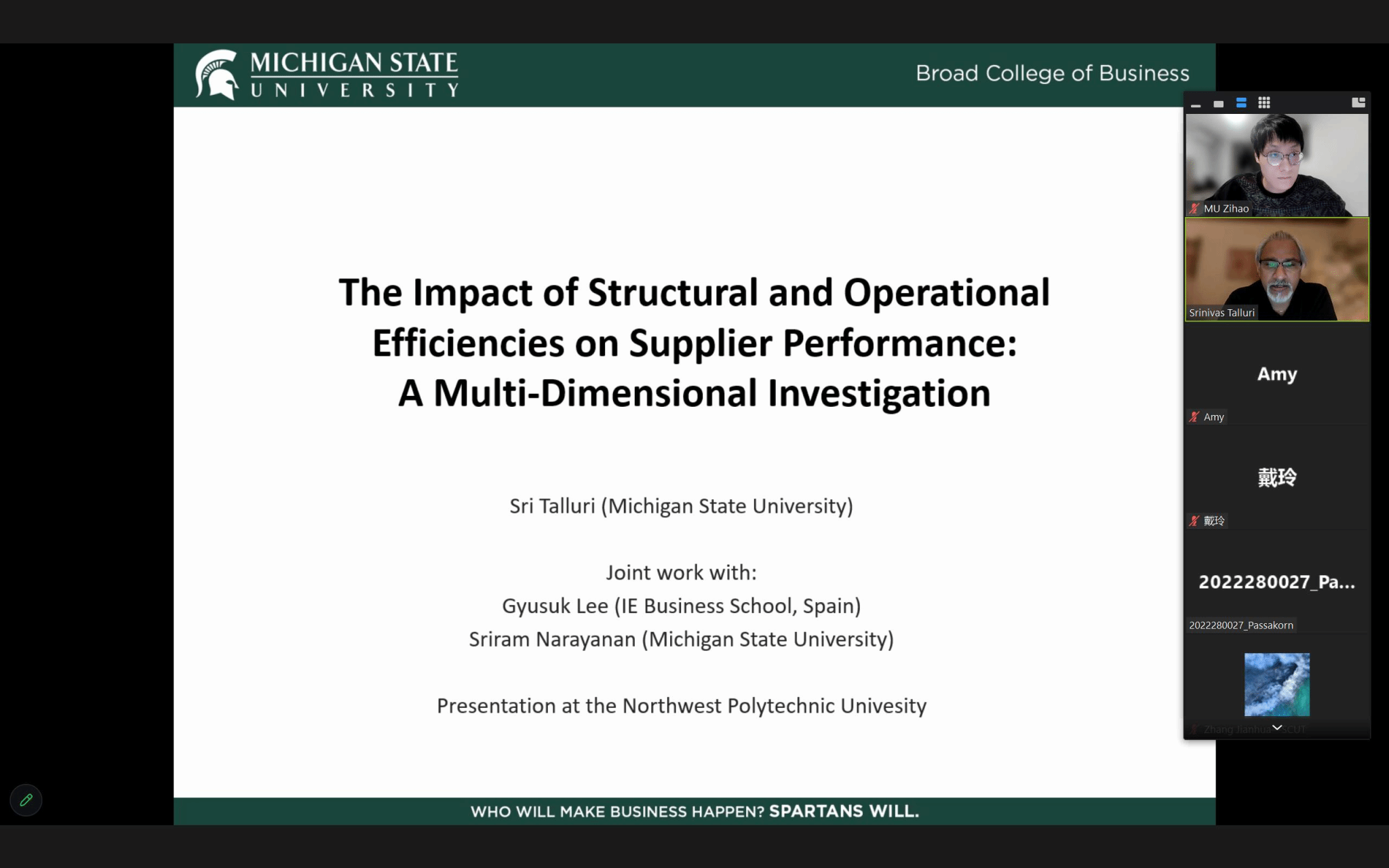 邀请,美国密歇根州立大学(Michigan State University)Eli Broad商学院讲席教授Srinivas (Sri) Talluri以线上报告会的形式和学院师生开展学术交流,作题为“制造和结构效率对供应商的影响:一种多维调查方法”(The Impact of Manufacturing and Structural Efficiencies on Supplier Performance: A Multidimensional Investigation)的学术报告。本次报告会由牟梓豪副教授主持,厕拍