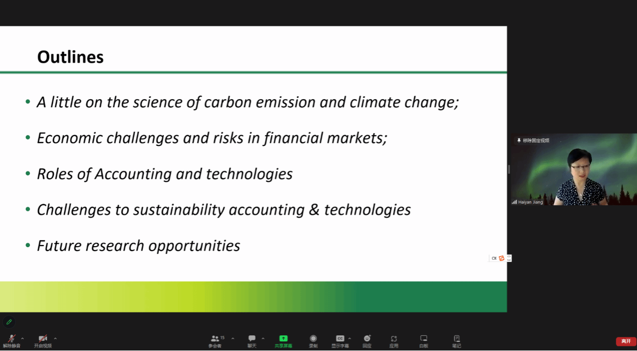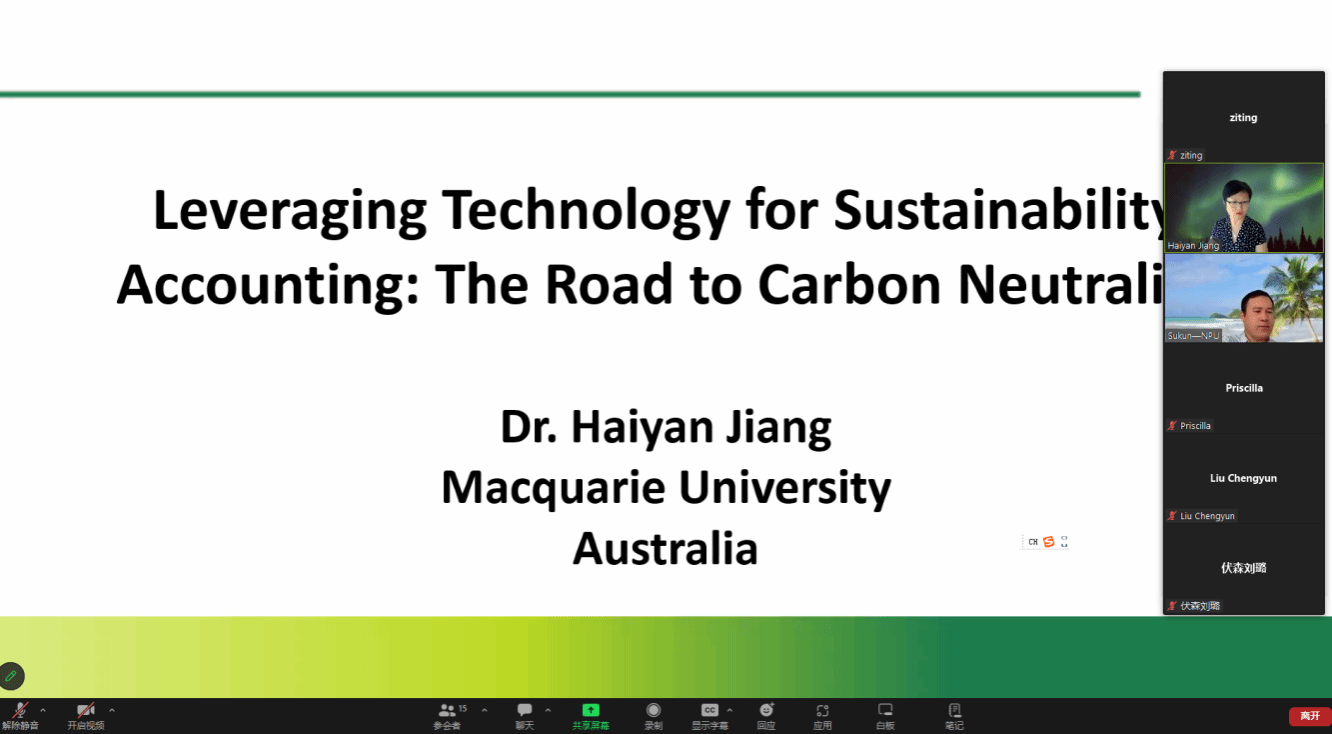 邀请,澳大利亚麦考瑞大学会计学副教授姜海燕通过线上形式作了题为“应用技术进行可持续性会计核算:碳中和之路(Leveraging technology for sustainability accounting: The road to carbon neutrality)”的讲座。本次讲座由苏坤教授主持,厕拍