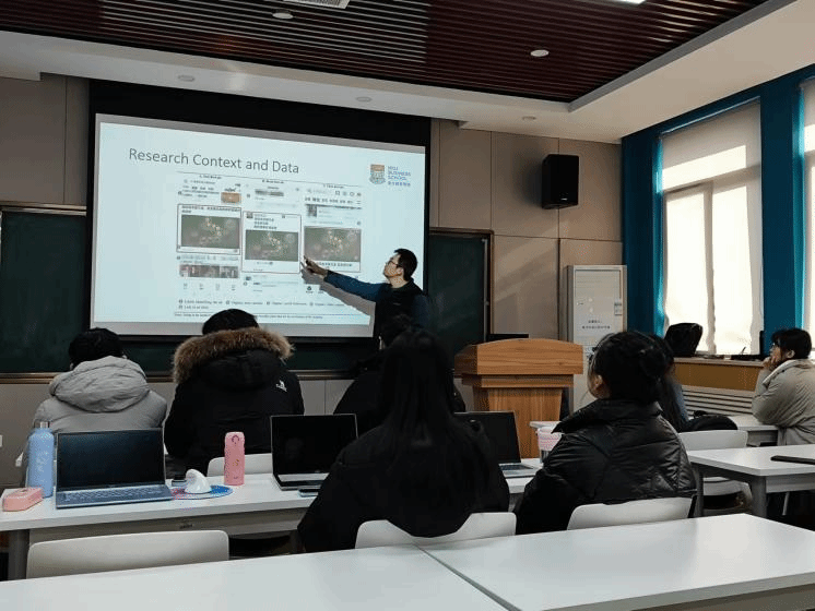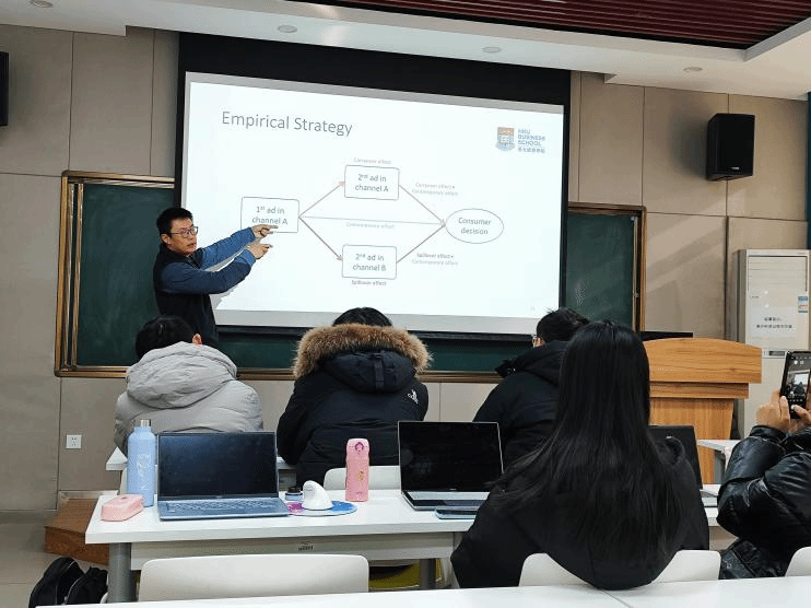 师生对庄梦舟的到来表示了热烈欢迎。在本次讲座中,庄梦舟详细介绍了自己在营销学领域的最新研究成果,以某游戏公司广东省数据为范例,探讨了如何量化三种不同广告渠道中同时、延续和溢出效应,从而帮助广告商更好地理解广告投放效果,以及优化广告策略以提高广告转化率。