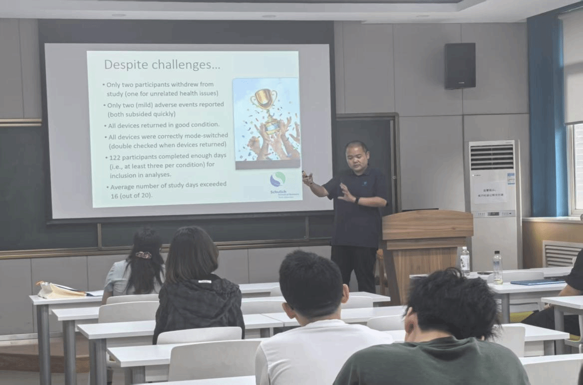讲座伊始,常玉简要介绍了祝磊的专业背景与科研成果。祝磊在报告中系统探讨了非侵入性迷走神经刺激技术对缓解职场焦虑、提升员工日常工作效率的潜在作用。研究通过动态试验设计,揭示了生物干预技术如何通过调节自主神经系统影响个体的情绪状态与工作表现。这一创新性研究不仅为管理学与神经科学的交叉融合提供了实证范例,也为企业改善员工心理健康、优化组织管理实践提出了前沿解决方案。