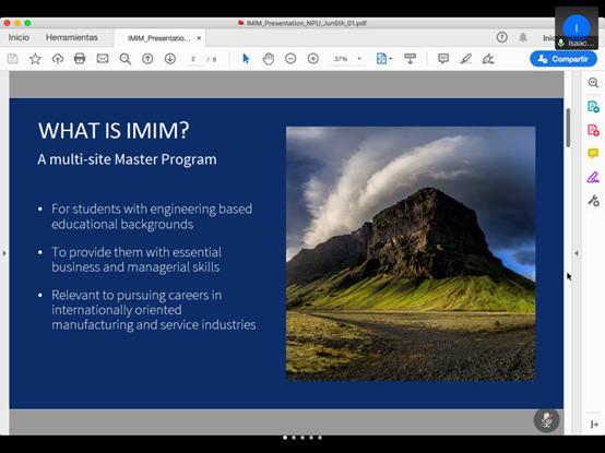 随后,由IMIM项目发起单位马德里理工大学工业工程学院的Isaac Lemus教授为大家详细介绍IMIM项目,参与此项目的学生将会前往多个国家进行学习,课程通过传授专业及工程领域的管理技能,专注于培养学生在国际制造业和服务业的商业技能。学生在前两学期分别在英国赫瑞瓦特大学和西班牙马德里理工大学学习,随后学生可以根据自己研究方向及兴趣,自主选择第三学期的学习地点,实现真正的国际化交流。参与本项目的学生在成功毕业后获得英国赫瑞瓦特大学和西班牙马德里理工大学的硕士学位证书,并同时获得第三学期所进行学习的院校证明文件或证书。Isaac Lemus教授也介绍了参与本项目学生的背景构成、项目费用,并强调的IMIM项目的特点以及它的独特性,鼓励学生参与本项目。