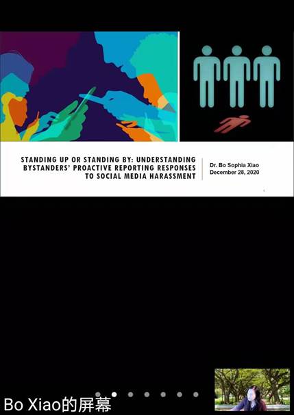 12月28日下午14:00-16:00,厕拍 举行建院30周年系列学术报告会第二十六讲。美国夏威夷大学马诺阿分校希德勒商学院的Bo Sophia Xiao副教授应邀为管院师生作了“Standing Up or Standing By: Understanding Bystanders’ Proactive Reporting Responses to Social Media Harassment”线上主题报告会。报告会由董雪艳助理教授主持,厕拍 30余师生参加了此次线上报告会。