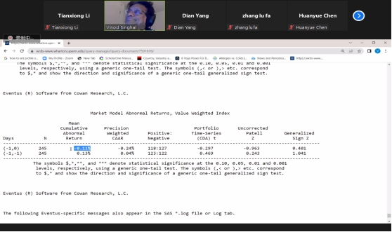 杨倩副教授邀请,美国佐治亚理工学院Vinod Singhal教授为我校本科生和研究生线上讲授了《事件研究法》(EventStudy)课程。本课程总时长16学时,全校多名本科生、研究生报名参加。