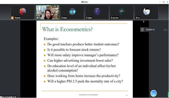冷奥琳副教授邀请,英国利物浦大学饶瑶副教授于2022年6月27日至2022年7月18日为学院本科生、研究生开设了《计量经济学I》和《计量经济学II》的课程。两门课程全程均以在线形式授课,讲授课程内容为计量软件操作教学,全校多名学生参加。课程总时长为64个学时。