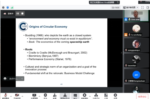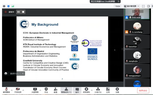 2022年7月4日到7月25日,应邵婧副教授邀请,克兰菲尔德大学的Enes Unal副教授通过线上课堂的形式讲授了《循环商业模式创新》(Circular Business Model innovation)暑期课程,总时长为16学时,全校多名本科生及研究生参与。