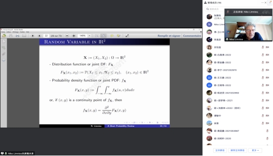2022年7月27日至8月11日,应我院吴蓓副教授邀请,法国贡比涅技术大学应用数学实验室的Nikolaos LIMNIOS教授为我校硕博研究生线上讲授了《应用随机过程》(AppliedStochastic Processes)课程,该课程总时长为32学时,吸引了我校多名师生前来聆听。