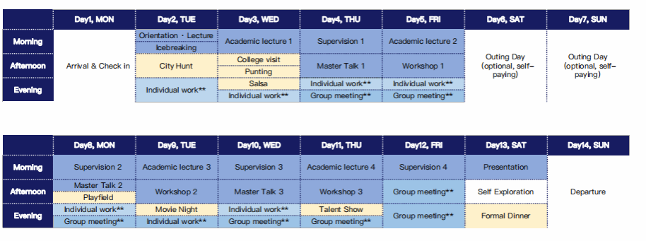 为期2周密集型导师制学术科研项目的关键部分是培养科研能力。在剑桥大学导师和助教的指导下,进行所选学科方向的深入学习和研究,接触这一学科领域最新的知识、最前端的创新和研究成果。学习者将通过剑桥大学教授提供的互动讲座/活动,以及剑桥大学博士生助教带头的小组辅导,培养对该学科的兴趣,提高科研能力。学习者将通过剑桥大学下属机构组织提供的工作坊,提升学术软实力和职业竞争力。学习者将以小组的形式开展各种类型的学习和科研项目,并在最终学术汇报上发表研究报告/演讲。课程收获:学院邀请函、结业证书、成绩报告、项目学分(具体学分由校方根据成绩评估)