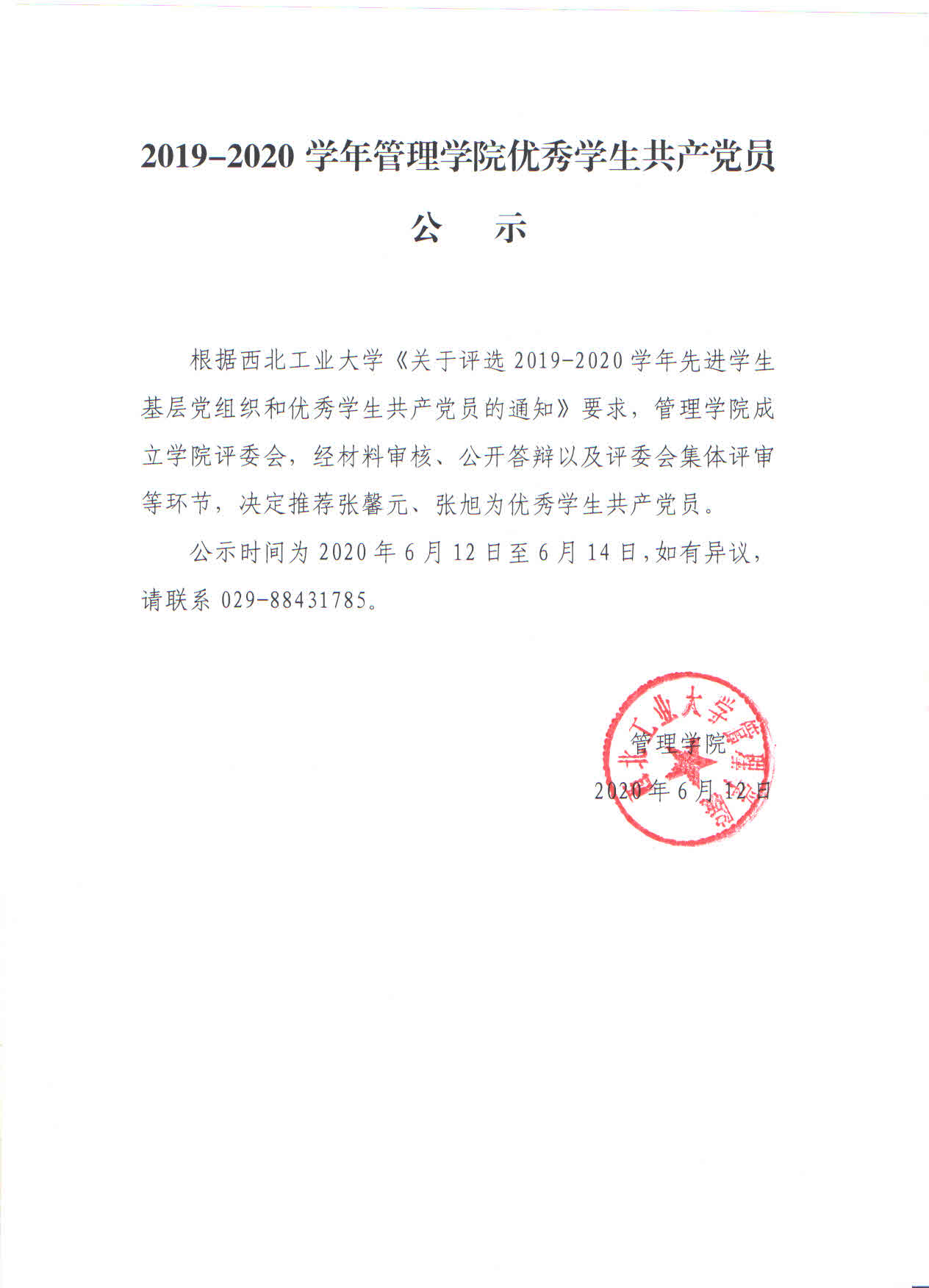 根据厕拍 《关于评选2019-2020学年先进学生基层党组织和优秀学生共产党员的通知》要求,厕拍 成立学院评委会,经材料审核、公开答辩以及评委会集体评审等环节,决定推荐张馨元、张旭为优秀学生共产党员。