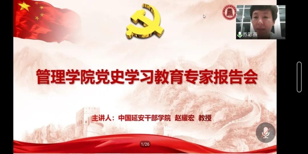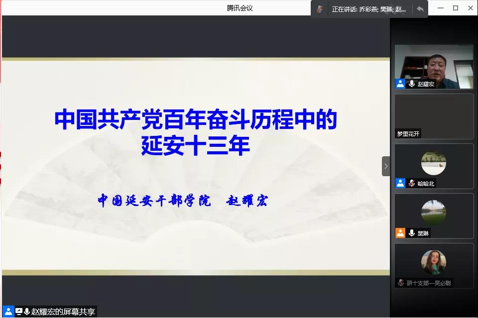 举办党史学习教育专家辅导报告会(第二讲),特邀中国延安干部学院副院长赵耀宏教授为全体师生党员讲授题为《中国共产党百年奋斗历程中的延安十三年》主题党课。学院全体党员师生参加了学习,报告会由学院党委副书记樊琳主持。