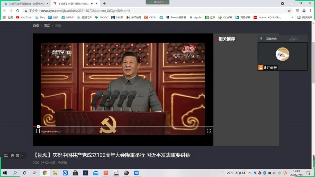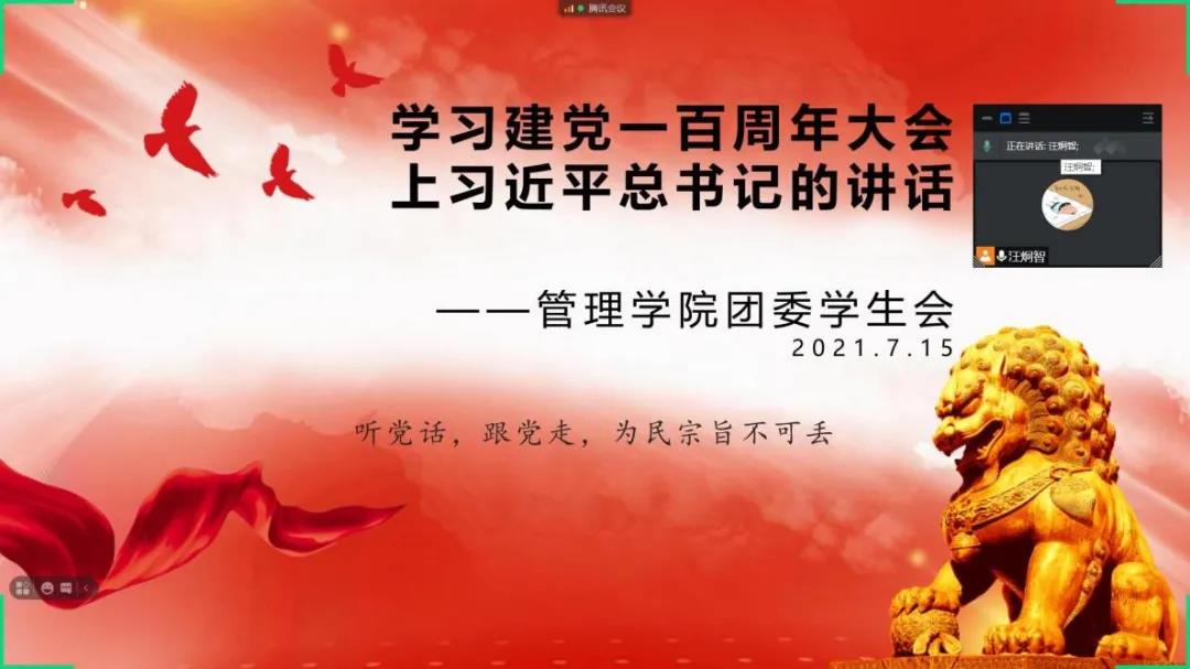 团委学生会于2021年7月15日开展“学党史、强信念、跟党走”青年志愿者“学党史、晓党事”学习系列活动,在线上集体学习习近平总书记在建党一百周年大会上的讲话,并交流心得体会。