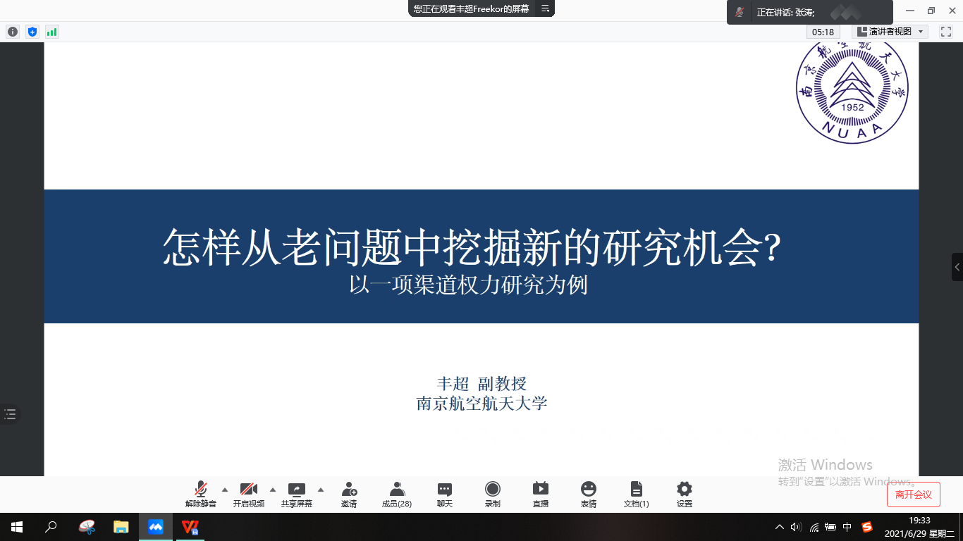 2021年6月29日晚上,南京航空航天大学副教授丰超老师做了题为“怎样从老问题中挖掘新的研究机会——以一项渠道权力研究为例”的报告。报告通过腾讯会议平台直播,由张涛副教授主持,厕拍