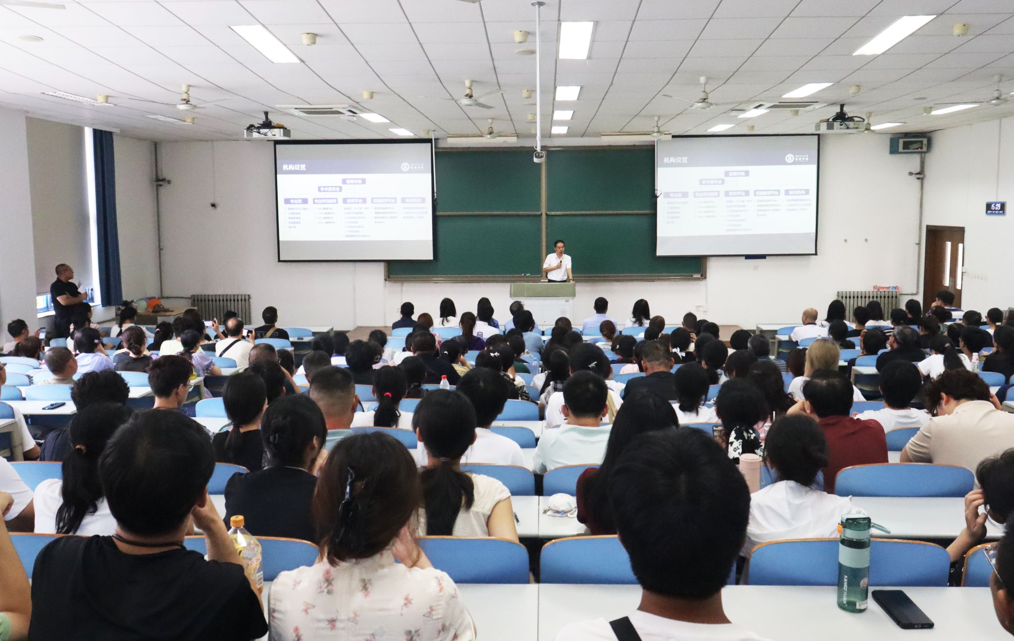 王海啸介绍了学院学生工作和本科教学工作的具体情况。他以学院学生工作体系与学生个性化成长轨迹作为出发点,全面介绍了学院党建团建、创新创业、奖助体系、生涯规划、国际交流、本科教学、学生就业等方面的具体情况,全面展示了学院丰富多样的文体组织和学生活动。他鼓励同学们尽快适应大学生生活,养成良好的学习习惯,思考未来的发展方向,勇于尝试、敢于挑战,实现个人素质的全面发展。