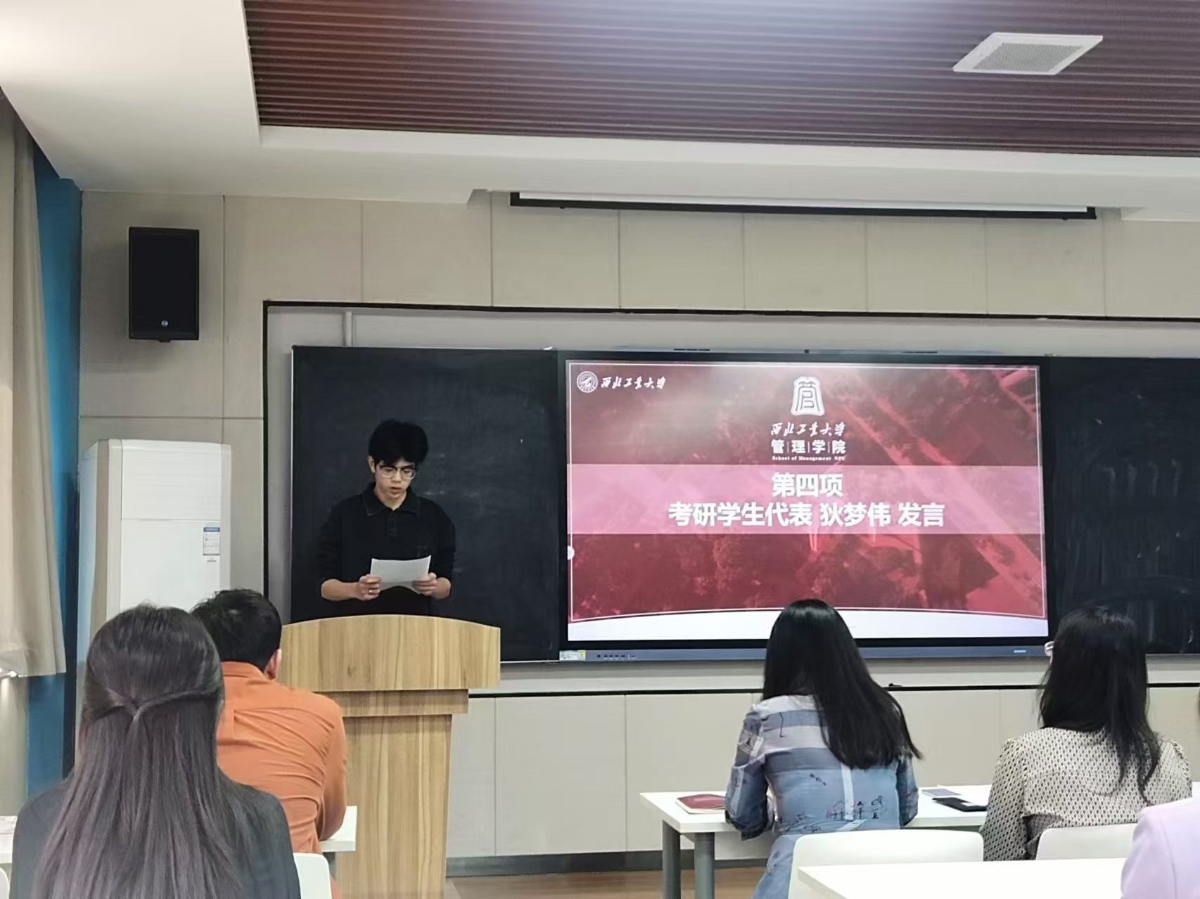 考研学生代表狄梦伟表达了对学院领导、老师们以及学长学姐们的感激之情。他提到,考研不仅是一场知识的较量,更是一次心态与毅力的考验。他鼓励考研同学珍惜与学长学姐们的每一次交流机会,虚心求教,主动吸收,将成功经验转化为自己的行动指南。