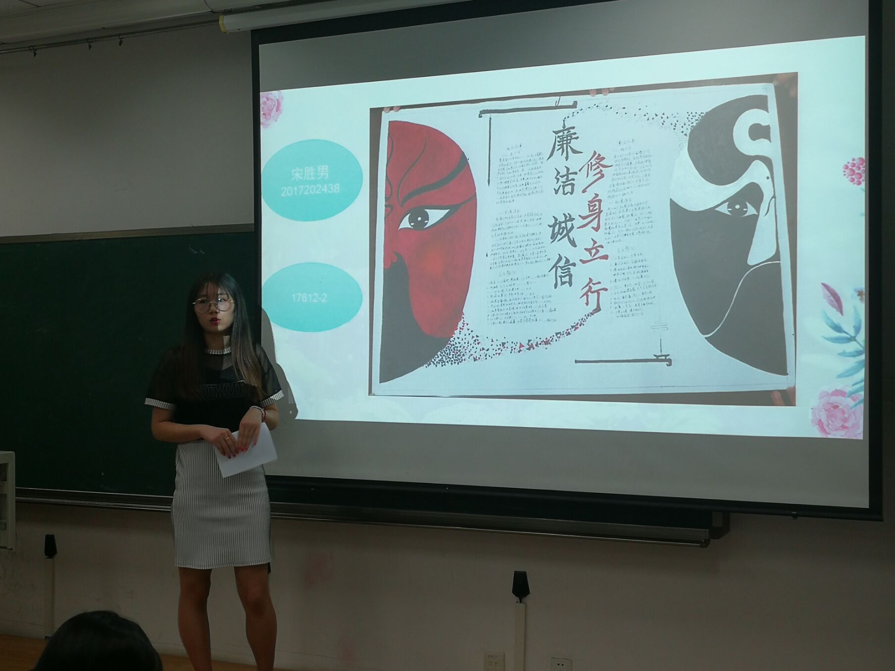 学生会主席卜国玲、副主席宋昊静。参赛的24支队伍都能做到紧扣主题,围绕“廉洁诚信”的主题展开想象以及创作,作品各具特色。无论是铁面无私的包拯,还是忠诚公正的关公;无论是出淤泥而不染的莲花,还是刚正不阿的竹子;无论是横平竖直的端正,还是撇捺点钩的严谨。无一不传达了“公”、“诚”二字的内涵。参赛选手现场的讲解也能紧扣主题,从作品的字体、作图、内容以及寓意各个方面层层剖析,向评委以及观众展现了作品中蕴含的“隐形”寓意,字字句句无不为突出“廉洁诚信,从我做起”的主题铺垫,可谓精彩至极。
