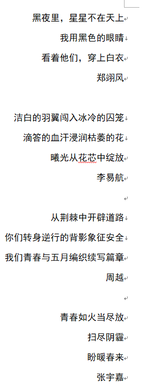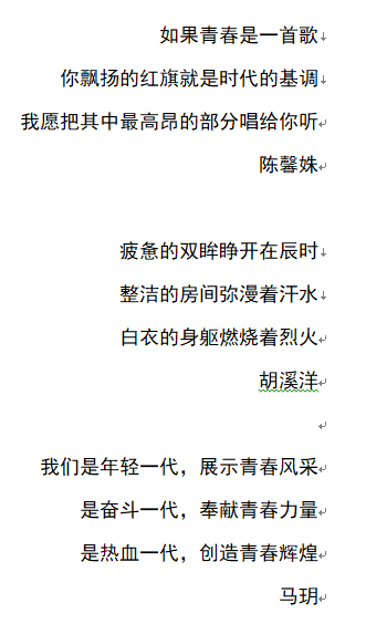 2019级同学们在各团支部书记组织下积极参与了此次活动。DL081903班团支部书记张瑜在线上召开了团日活动的准备会议。线上会议时,团支书提出建议——手写五四赞歌,汇集手写诗歌照片,朗诵并录制视频。大家都给出了热烈的回应——“做,就做到最青年、最青春。”同学们一致决定使用白纸黑笔来书写大家一起精心挑选的《五四之歌》,有书法功底的同学的书写成果更是令人赞叹。大家对朗诵的热情极高,志愿担当本次团日活动视频的朗诵主角。他们分工协作,成立朗诵小集体,进行排练录制。